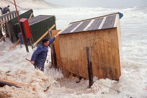 Strandexploitant Geert Janse met strandhokjes die door hoogwater en sterke wind op het strand van Zoutelande zijn beschadigd. Foto: E.H. Hardon, 29-7-1965. Bron: ZB/Beeldbank Zeeland, rec.nr. 170644
