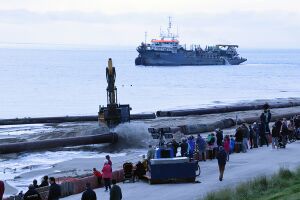 Toeschouwers kijken vanaf de dijk naar de werkzaamheden op het strand. Tijdens het opspuiten van het strand bij Zoutelande. Op de achtergrond een werkschip voor de kust. Foto: J. Francke, 2021. Bron: ZB/Beeldbank Zeeland, rec.nr. 181119