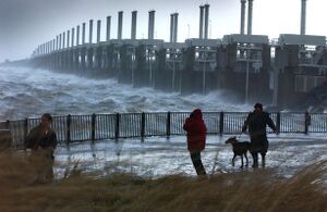 Primaire deltadam in de mond van de Oosterschelde tussen de noordwesthoek van Noord-Beveland en de zuidwesthoek van Schouwen.
