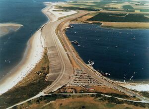 Luchtfoto van de Veerse dam gezien vanaf Vrouwenpolder. Foto: Deltaphot Luchtfotografie, 1983. Bron: ZB/Beeldbank Zeeland, rec.nr. 45667