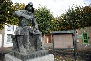 Standbeeld van Willem Breukelszoon, volgens een legende de uitvinder van het haringkaken. Beeld op natuurstenen voetstuk. Het beeld is onthuld door Commissaris der Koningin De Casembroot tijdens de Beukelfeesten in 1958. Foto: M. van de Velde. Bron: ZB/Beeldbank Zeeland, rec.nr. 171192