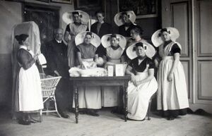 Bakers in opleiding; wijkzuster juffrouw Wesdorp en dr. Herman Reinders Folmer (1869 - 6 juli 1928) leiden een cursus voor aanstaande kraamverzorgsters; Herman Reinders Folmer was huisarts en gemeente geneesheer van Driewegen. Botste met zijn auto op de overweg (Platteweg) tegen de motorwagen van de tramlijn, waarna hij overleed; protestantse dracht; gepubliceerd in De Prins van 13 Jan. 1923. Bron: ZB/Beeldbank Zeeland, rec.nr. 103618