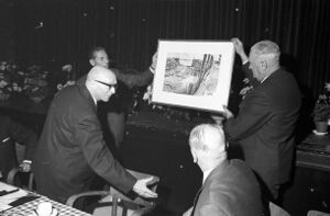 Commissaris der Koningin mr. J. van Aartsen opende het nieuwe polderhuis van waterschap Noord-Beveland aan de Julianastraat te Kortgene. Ontwerp: Architectenbureau Rothuizen en 't Hooft. Namens de Unie van Waterschapsbonden bood P.J.J. Dekker, voorzitter van de Zeeuwse Polder- en Waterschapsbond, het waterschap een aquarel aan van de kunstschilder Joop Dam (Haarlem), voorstellende de oude haven van Colijnsplaat met op de achtergrond de nieuwe Oosterscheldebrug (vanaf april 1967 Zeelandbrug geheten). Foto: C. Kotvis, 28-10-1966. Bron: ZB/Beeldbank Zeeland, rec.nr. 104572