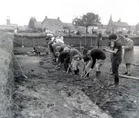 In de 3e week van juli 1966 werd (voor de vijfde maal in Aardenburg) het jaarlijkse studiekamp van de Archeologische Werkgemeenschap voor Nederland gehouden, met 40 deelnemende amateur-archeologen (onder wie vele jongeren); met succes werden opgravingen verricht naar resten uit de Romeinse periode; de supervisie van het opgravingswerk berustte bij ir. J.A. Trimpe Burger van de Rijksdienst voor het Oudheidkundig Bodemonderzoek. Foto: J. Midavaine, juli 1966. Bron: ZB/Beeldbank Zeeland, rec.nr. 92660
