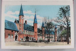 Een deel van het abdijcomplex en het Abdijplein. Prentbriefkaart, ca. 1910. Bron: ZB/Beeldbank Zeeland, rec.nr. 31869