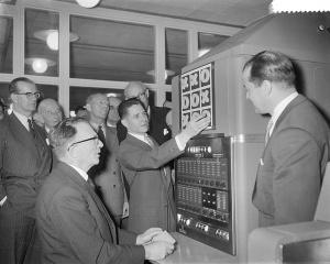 Ir. A. W. van der Plassche van de Nederlandse Heide Maatschappij stelt elektronische administratiemachine in gebruik te Arnhem, 28 maart 1957, Foto: Nationaal Archief, Bron: Wikimedia Commons | |