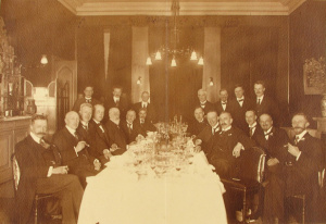 Diner bij het 40-jarig ambtsjubileum van dr. J. Bolle van het Gasthuis; zittend uiterst rechts (met snor en sigaar): dr. Staverman. Fotograaf onbekend. Bron: ZB, Beeldbank Zeeland, nr. 123470 | |
