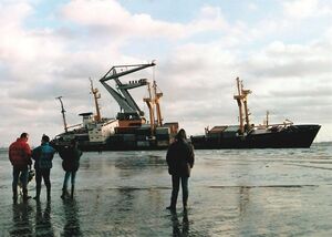 Stranding Russisch vrachtschip Pioneer Onegi, op 8 december 1994 in moeilijkheden gekomen als gevolg van harde wind en het schuiven van de lading, Wijsmuller IJmuiden heeft het bergingscontract en is bezig containers te lossen. Foto: C. Heijkoop, 11-12-1994. Bron: ZB/Beeldbank Zeeland, rec.nr. 44053