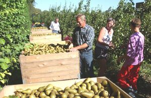Perenoogst op biologisch-dynamisch bedrijf Ter Linde (Oostkapelle). Foto: J. Wolterbeek, 2002. Bron: ZB/Beeldbank Zeeland, rec.nr. 103350