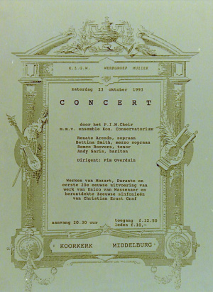 Concert door P.I.M. Choir en ensemble Kon. Conservatorium o.l.v. Pim Overduin met o.a. de herontdekte Zeeuwse sinfonieën van Christian Ernst Graf in de Koorkerk, fotograaf onbekend, 23-10-1993, ZB, Beeldbank Zeeland, recordnr. 14971 | |