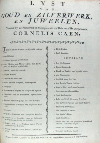 Lijst van geplunderd goud- en zilverwerk en juwelen uit de woning van Cornelis Caen, burgemeester van Vlissingen in 1787, affiche, ZB, Beeldbank Zeeland, recordnr. 153091 | |