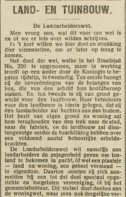 Artikel over de Landarbeiderswet in de Maas- en Scheldebode van 20 november 1918, bron: http://www.krantenbankzeeland.nl