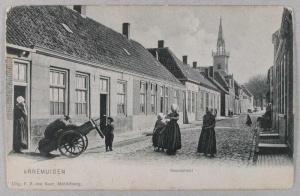 Handkar met zakken erwten, die men vanuit Middelburg haalde om ze thuis te lezen. Als ze uitgelezen waren moest men ze weer terug naar Middelburg brengen, en als het goed was gebeurd had men zeventig cent per mud verdiend, een karwei waarmee veel arme gezinnen zich 's avonds bezig hielden, zoals beschreven in Arm Middelburg..., prentbriefkaart, Zeeuwse Bibliotheek, Beeldbank Zeeland, recordnr. 41914. | |