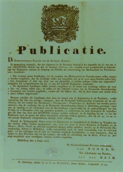 Publicatie omtrent inrichting van scholen ter aankweking van heelmeesters en vroedvrouwen, 2 juni 1826, affiche, ZB, Beeldbank Zeeland, recordnr. 4850