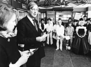 Scholieren van de Sint Willibrordusschool in Zierikzee overhandigen de eerste kinderpostzegels aan burgemeester J. Asselbergs en zijn echtgenote in het postkantoor. Foto: P. Honhoff, 11-11-1987. Bron: ZB/Beeldbank Zeeland, rec.nr. 168806