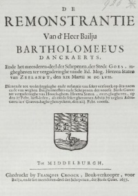 - De remonstrantie van d'heer bailju Bartholomeeus Danckaerts, ende het meerderen-deel der schepenen, der stede Goes, ... den XIX martii MDCLVII (Middelburgh, 1657).