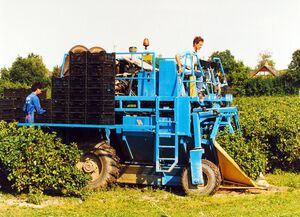 Het machinaal oogsten van zwarte bessen te Heinkenszand. Foto: J. Wolterbeek, 1998. Bron: ZB/Beeldbank Zeeland, rec.nr. 129273