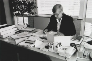 Directrice Truus Huisman aan het werk in de directeurskamer van de Zeeuwse Bibliotheek, foto: Wim Helm, augustus 1995, Zeeuwse Bibliotheek, Beeldbank Zeeland, recordnr. 81