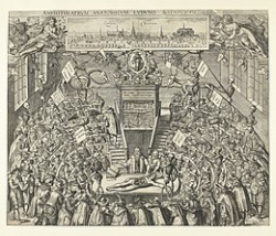 Galenus Abrahamsz studeerde geneeskunde in Leiden. Prent van Theatrum anatomicum, Leids Anatomisch Theater, 1609. Rijksmuseum Amsterdam. In het midden een hoogleraar (Petrus Paaw?) die anatomische les geeft staande achter een tafel waarop een ontleed menselijk lichaam; bij hem staat zijn amanuensis. Bron: Wikimedia Commons.