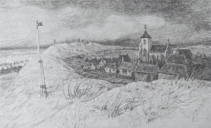 Uit de tekening wordt ook duidelijk dat de jongen die zijn duim in de dijk steekt, dit in werkelijkheid in het talud van het duin doet. Waarom Rhead Zoutelande desondanks zeer geschikt vond als lokatie voor de jongen lezen we in de beschrijving die Boughton bij het dorp geeft in Sketching Rambles:Down far below us lay the village. So far that had the waters swept over the sandy dike, the sea would have only reached its level, when it played around the tail of the weather-cock of the gray old churchtower. Vervolgens sloot hij af met een alomvattende vrees voor het wassende water rondom hem en de godvrezende inwoners: We felt deadly oppressed by the prevailing seriousness of the place.[4]