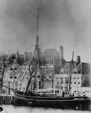 Vissloep "De Zeeuw", het eerste schip gebouwd (1876) bij de Koninklijke Nederlandsche maatschappij van scheepsbouw "De Schelde" (bouwnr. 1) voor de Vlissingsche Zeevisscherij Mij.; kiellegging door burgemeester Winkelman op 18 mei 1876. Foto: ca. 1880. Bron: Beeldbank Zeeland, rec.nr.48999.
