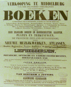 Affiche naar aanleiding van de verkoping van o.a. boeken gedeeltelijk nagelaten door Jacob Ehrlich (1864). Verzameling Altorffer. Bron: ZB, Beeldbank Zeeland, rec.nr. 1787 | |
