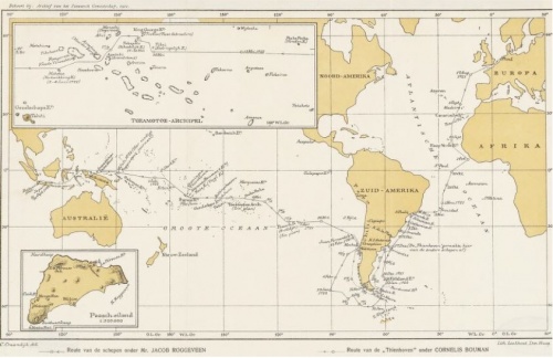Kaart van de wereld met de route van de ontdekkingsreis van mr Jacob Roggeveen met de schepen de Arend, Tienhoven en de Afrikaanse galei. Met linksboven kaart van de Tuamotu-archipel en linksonder van het Paaseiland, bron: Archief (1911) na pag. 183. | |