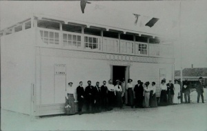 Jacoba van Heemskerck (staand midden in de deuropening) temidden van andere kunstenaars bij het tentoonstellingsgebouwtje in Domburg in 1912, foto, ZB, Beeldbank Zeeland, recordnr. 19499