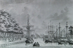 Rechts een stukje van de Kinderdijk met daarachter de Maisbaai te Middelburg. Gewassen tekening door J. Bulthuis, 1791. Bron: ZB, Beeldbank Zeeland, rec.nr. 10885. | |