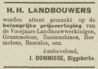 Advertentie voor de verkoop van landbouwmachines door J. Dommisse in 1923, bron: Krantenbank Zeeland, de Zeeuw, 12 februari 1923, pag. 4.