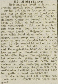 Na met NAC een landskampioenschap en twee Zuidelijke kampioenschappen gevierd te hebben slaat op 19 juli 1923 in Middelburg het noodlot toe. De dan 29-jarige loodgieter maakt tijdens werkzaamheden vanaf het dak van de Koorkerk bij de abdij een fatale val en overlijdt enkele uren later aan zijn verwondingen. Jo Schot laat een hoogzwangere vrouw en twee kinderen achter. Bij de begrafenis op 23 juli dragen de NAC-spelers de kist, die bedekt is met de geelzwarte vlag van de club, en bewijzen zodoende op gepaste wijze de laatste eer aan een onvergetelijke held.