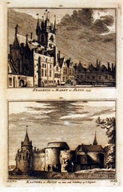 Jodocus (Joost) van Lodenstein was onder andere predikant te Sluis. Tekening stadhuis en markt van Sluis, 1743. H. Spilman, naar tekening van A. de Haen. Bron: ZB, Beeldbank Zeeland, rec .nr. 889. | |