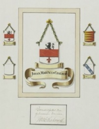 Het wapen van Johan Marinus Chalmers, secretaris van de Rekenkamer en de Staten van Zeeland (1766-1770), raadpensionaris (1770-1785) in omlijnde ruimte, geflankeerd door de 4 kwartierwapens Chalmers, Duvelaer, Huijgens en een leeg schild (Gordon), met koord en guirlande, (circa 1800), bijgevoegd zijn handtekening en afdruk van zijn cachet in zwarte lak, KZGW, ZI III, 647 | |