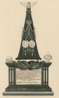Het grafmonument van Isaac Hurgronje, gebouwd door J. Camhout, beeldhouwer uit Middelburg, met allegorische voorstelling, opschrift en hun wapens, KZGW, ZI II, 1502. | |