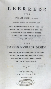 Titelblad van Leerrede over psalm CXXII, vers 1-4, gehouden den 20 van Bloeimaand 1792 ter gedachtenisse van den opbouw en de inwyding der Luthersche kerk binnen Middelburg, op den 20 May van 't jaar 1742, geschreven door Johannes Nicolaas Damen (1793), ZB, Beeldbank Zeeland, recordnr. 153155. | |