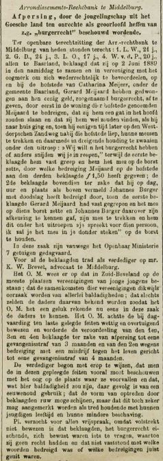 In 1889 botste deze gewoonte echter met de Nederlandse wet toen vier jongeren uit Baarland Gerard Meijaard onder bedreiging met ernstige verwondingen en met getrokken messen het burgerrecht vroegen nadat hij de hoeve waar hij verkering met de dochter had, had verlaten. Hij had tenslotte met het mes op de borst anderhalve gulden betaald. De vier Baarlanders, in leeftijd variërend van 17 tot 24 jaar, werden aangeklaagd wegens afpersing. Het Openbaar Ministerie wees er daarbij op dat deze verenigingen ‘dikwijls oorzaak worden van allerlei baldadigheden.’ Dit zou onder meer kunnen verwijzen naar het feit dat het geld dat met het burgerrecht werd verkregen, (meteen) werd omgezet in drank. De verdediger van de beklaagden sprak van ‘een eeuwenoud gebruik.’ Uiteindelijk kregen, na een eis van drie en vier maanden, alle vier de Baarlanders een gevangenisstraf van twee weken opgelegd.