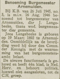 Krantenbericht over de aanstelling van Langebeeke als burgemeester in de Zeeuw van 31 juli 1946, pag. 1, bron:Krantenbank Zeeland | |