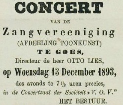 Aankondiging van een concert onder leiding van Otto Lies in de Goessche Courant van 9 december 1893, pag. 4, bron: Krantenbank Zeeland
