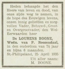 Overlijdensadvertentie van de familie voor Lourens Boone, bron: De Zeeuw, 26 april 1935, pag. 3 | |