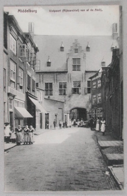 Laurens Lasonder was lange tijd verbonden aan het Rijksarchief in Middelburg. Prentbriefkaart van Gistpoort en daarboven het Rijksarchief, gebr. Hildernisse, ca. 1920. Bron: ZB, Beeldbank Zeeland, rec.nr. 13313.