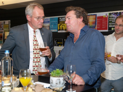 Tijdens de uitreiking van de Zeeuwse Boekenprijs 2017 in de Zeeuwse Bibliotheek. Commissaris van de Koning en jurylid drs. J.M.M. (Han) Polman (links) in gesprek met Leo Hannewijk (midden), directeur van Film by the Sea. Rechts schrijver Jan Vantoortelboom, 4-11-2017. Foto: ZB/Beeldbank Zeeland, M. Meijer-Van der Linde, rec.nr. 164027