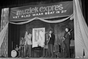 Beatgroep Flarth uit Vlissingen in het Concertgebouw tijdens de tour van het blad Muziekexpres; v.l.n.r. Helmy Siegers, Eddy van Broekhoven (overleden), Leo van de Ketterij, Ko Riemens (overleden), foto: J. Midavaine, ca. 1965, ZB, Beeldbank Zeeland, recordnr. 100347