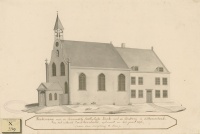 Teekening van de Roomsch-Catholijke kerk met de Pastory te 's Heerenhoek in het eiland Zuid-Beveland, gebouwt in het jaar 1796 (van den dorpsweg te zien) door Dhaenens, ca. 1830, KZGW, ZI II, nr. 1492. | |