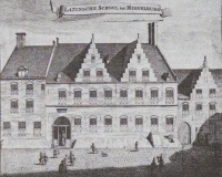 De Latijnse school te Middelburg, eind zeventiende eeuw, Claysonne was hier kortstondig rector, bron: Cronyk van Zeeland van Mattheus Smallegange (Middelburg, 1696). | |