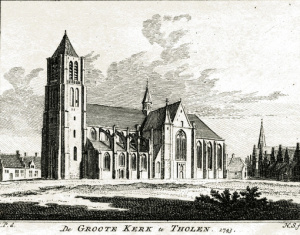 Grote Nederlands hervormde kerk in 1743 door H. Spilman uit collectie Anderson. Jan Marinus en Johanna Poulier liggen begraven in het nog gave graf nr. 24 in het koor der Nederlands Hervormde Kerk te Tholen. Bron: ZB, Collectie tekeningen en prenten in Beeldbank Zeeland, nr. 2397.