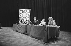 Fondse (midden, donker pak) in 1970. Discussie tussen uitgevers en schrijvers over boekenmarktboycot van schrijvers in RAI, Amsterdam, georganiseerd door Vrij Nederland. Fotograaf : Verhoeff, Bert / Anefo. Bron: Wikimedia Commons. | |