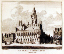 In zekere zin werd Middelburg een poort van Europa, weliswaar in geduchte concurrentie met Brugge, Antwerpen en Bergen op Zoom, maar Middelburg kon zich naar voren schuiven, dank zij zijn onvolprezen rede van Arnemuiden, terwijl Brugge steeds meer last ondervond van het dichtslibben van zijn aanvoerwegen en Antwerpens nadeel! de Honte nog slecht bevaarbaar was. Daar komt bij dat de landsheer en de plaatselijke overheid deden wat zij konden om het de buitenlandse kooplieden met privileges zo aangenaam mogelijk te maken. In het begin ging het hoofdzakelijk om laken en wijn, later passeerde alles wat verhandelbaar was de Middelburgse rede. De diversiteit van goederen was even groot als de diversiteit van nationaliteiten. In het kielzog van de Merchant Adventurers en de kooplieden van de Hanze, verschenen er Schotten, Engelsen, Duitsers, Bretons, Normandiërs, Genuezen, Venetianen, Portugezen, Spanjaarden enz., aanvankelijk op grond van het aan de Arnestad verleende stapelrecht, later op grond van stapelprivileges en bilaterale stapelverdragen. Niet al tijd waren deze verdragen even stabiel: grote buitenlandse organisaties als de Hanze en de Merchant Adventurers zochten allereerst hun eigen voordeel, zodat zij nu eens in Middelburg dan weer elders hun basis hadden. Een veelgehoorde klacht, die Middelburg eigenlijk nooit helemaal heeft kunnen ondervangen, was het gebrek aan voldoende of aantrekkelijke retourvracht (later zou dit bijdragen tot het verval van de stad: er viel letterlijk niets te halen, het was een uithoek). Niettemin bleef het vooralsnog op de rede een komen en gaan van koopschepen en nam de welvaart ongekende proporties aan. Het waren immers niet alleen de kooplieden die van de handel profiteerden, de hele burgerij had er via toevoerbedrijven en -dien sten een aandeel in. Bladeren in de stadsrekeningen geeft een inzicht in die afgeleide activiteiten: heudelieden voor het overslag verkeer, maar ook voor de transito op Engeland of Antwerpen, makelaars, waarden (Middelburg moet een bloeiend kroegleven hebben gehad en de nu zo net gerestaureerde Spanjaardstraat was eens de enige plek, waar de meisjes van plezier hun nering mochten bedrijven), ballasters (lieden die zand haalden van de platen in de Schelde voor schepen die geen retourvracht hadden), haringpakkers, kraankinderen, balanskinderen, houttuiners, wijnslepers, kurktellers, fruitpakkers enz. In 1559 behaalde Middelburg nog een mooi succesje in een proces tegen Antwerpen, want toen erkende de Grote Raad dat Middelburg het stapelrecht had voor wijnen op de Schelde. Van die tijd af liep driekwart van de wijnaanvoer naar de Nederlanden over Middelburg. Nieuwe tijd. Lang heeft die vreugde niet geduurd, in 1572 was alles afgelopen, niet slechts de handel, ook de meekrapindustrie, de lakennijverheid, de zoutraffinaderij, haringvisserij met de daarvan afhankelijke kuipersbedrijvigheid. Voor Middelburg braken zware tijden aan. Het kan de stedelijke overheid zeker niet zijn ontgaan dat er iets broeide. In het tweede kwart van de 16e eeuw kunnen op allerlei plaatsen ketterse denkbeelden worden gesignaleerd, terwijl daarnaast de kritiek op de levenswandel van de geestelijkheid steeds luider werd. De liberale overheid nam het niet zo serieus, ook niet toen er een bisschop kwam, die inquisiteur was geweest, evenmin toen zij opdracht kreeg scherp op te letten dat de oude religie in ere werd gehouden. Men meende met enig laveren de zaak wel in de hand te kunnen houden. Het bijwonen van `onbehoorlicke sermoenen ende predicatiën' werd verboden, maar op de naleving van het verbod werd nauwelijks gelet. Zelfs toen de beeldenstorm op 13 juli 1566 duidelijk had bewezen, dat het ernst begon te worden, trad men gematigd op; de hervormden die nu openlijk te voorschijn kwamen met een verzoek om een kerk, waar zij hun bijeenkomsten konden houden, kregen nul op hun rekest, maar preken buiten de Zuiddampoort (de Hagepreekgang bij de Dwarskaai herinnert nog aan de plek) werd toegelaten. Het strenge plakkaat, dat al voor de beeldenstorm had moeten worden afgekondigd, werd pas in 1567 opgehangen. Handelsbelangen zullen bij dit liberale optreden zeker op de achtergrond hebben gestaan en vormden ongetwijfeld het motief om nog in 1571 het betalen van de tiende penning te weigeren. Des te vreemder is het dan te moeten zien hoe Middelburg, na de overgang van Vlissingen en Veere naar de Prins, plotseling streng koningsgezind wordt en weigert met de opstand mee te doen. Manifesteert zich hier een Middelburgse stijl, die het beneden de waardigheid achtte zich in te laten met ordinaire zaken als revolutie? Is het de tegen stelling tot Veere, Vlissingen en Arnemuiden, die de stad bewoog zich afzijdig te houden? Belette het feit dat de hoogste rechts en bestuurscolleges zich binnen haar muren bevonden, haar de trouw te breken? Wilde het toen al voorbeeldstad' zijn? Een duidelijke motivering is niet gegeven. Misschien is de stad in haar aarzeling overrompeld en was zij omsingeld voor ze er erg in had. Wel slaagde de Spaanse gouverneur Mondragon er nog in door de belegering heen te breken en het stadsgarnizoen met verse troepen aan te vullen, maar ook zijn aanwezigheid kon het lot niet keren. Pogingen van Spaanse zijde om de stad te ontzetten faalden en na twee jaar beleg was ze, uitgehongerd, gedwongen zich over te geven. De Prins, die zelf het beleg had geleid, dicteerde de 'un conditional surrender'. Mondragon en de geestelijkheid werd vrije aftocht verleend. Middelburg kreeg een schatting opgelegd van f 100.000 en haar overheersende positie werd aan alle kanten verkleind en ingedamd. De ergste smaad was wellicht dat het altijd gekleineerde en machteloos gehouden Arnemuiden door de Prins tot stad werd verheven. Het zou niemand hebben verbaasd als de stad deze klap niet had overleefd. Middelburg liet zich echter zo gauw niet intimideren. Het was aangeslagen, maar niet verdoofd en langzaam krabbelde het weer over eind en probeerde de sterk geslonken invloed weer op