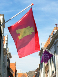 In 1366 bezaten de Middelburgers een stadsbanier, waarvoor de 'palloerlakens' rode damast) in Brugge werden gekocht. De tegenwoordige vlag werd bij raadsbesluit van 22 april 1974 als gemeentevlag vastgesteld en op 30 april 1975 wapperde deze vlag rood met een geel gekleurde burcht voor het eerst van de openbare gebouwen. De vlag wordt sinds 1695 vermeld, meestal als `geus' of `vlag voor de spiegel', dus voor gebruik op de boeg van schepen. Daarnaast was sinds C. Allard (ca. 1690) ook een geel-wit-rode vlag bekend. Deze werd in 1857 door de gemeente als stadsvlag aangewezen. Merkwaardigerwijs vermeldt een handschrift uit 1667 voor Middelburg twee geheel andere vlaggen, nl. een groen-wit-blauwe en een geheel groene. Mogelijk staan deze vlaggen in verband met de Zeeuwse Admiraliteit (vlaggekleur). Ook een rood-wit-blauwe vlag met gele burcht (1702) of blauwe burcht (1686) in de witte baan is gedocumenteerd. Naam: Na diverse fantasierijke naamsverklaringen in het verleden wordt thans de letterlijke als de meest waarschijnlijke beschouwd: burg in het midden of middelste burg. Middelburg is aldus schakel in een keten van burgen die, vermoedelijk op last van een centraal gezag, in de 9de eeuw werd aangelegd om de bevolking in tijden van nood enige veiligheid te bieden en de delta te beschermen tegen invallen van Vikingen burgen). In wat tegenwoordig Zeeland heet, liep deze keten van Oostburg over Souburg, Middelburg en Domburg naar Burgh op Schouwen. Middelburg lag dan midden tussen Souburg (Zuidburg) en Domburg (Duinburg?). Zie verder hieronder bij geschiedenis.