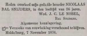 Rouwadvertentie van Nicolaas Bal Snijders in de Middelburgsche Courant van 9 november 1876, pag. 4, bron: Krantenbank Zeeland | |