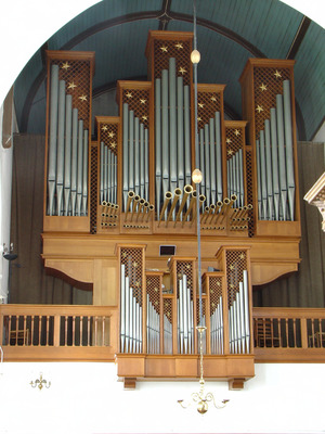 Hoofdwerk: 1. Prestant 16'. 2. Bourdon 16'. 3. Prestant 8'. 4. Roerfluit 8'. 5. Octaaf 4'. 6. Roerfluit 4'. 7. Octaaf 2'. 8. Quint 3'. 9. Cornet 4-5 st. 10. Mixtuur 4 st. 11. Basson 16'. 12. Trompet 8'. Bovenwerk: 1. Prestant 8'. 2. Holpijp 8'. 3. Viola di Gamba 8'. 4. Baarpijp 8'. 5. Octaaf 4'. 6. Open fluit 4'. 7. Zachtgedekt 4'. 8. Woudfluit 2'. 9. Echotrompet 8'. 10. Dulciaan 8'. Pedaal: 1. Prestant 16'. 2. Subbas 16'. 3. Violon 16'. 4. Octaaf 8'. 5. Gedekt 8'. 6. Octaaf 4'. 7. Quint 6'. 8. Bazuin 16'. 9. Trompet 8'. 10. Trompet 4'. 11. Zink 2'. Klavieromvang C-f'. Pedaal C-d'.